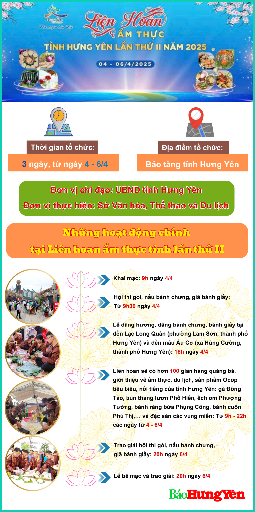 Liên hoan ẩm thực tỉnh Hưng Yên lần thứ II năm 2025 được tổ chức từ ngày 4 - 6/4. Chương trình nhằm tôn vinh, bảo tồn, phát huy các giá trị văn hóa, ẩm thực, du lịch, góp phần quảng bá hình ảnh Hưng Yên đến du khách trong nước và quốc tế; đẩy mạnh liên kết, hợp tác phát triển du lịch với các tỉnh, thành phố......